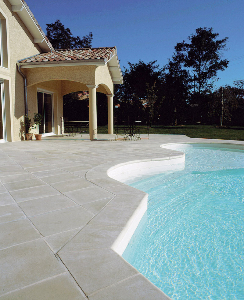 I bordi Piscine Solaris sono realizzati in pietra ricostruita antiscivolo ed antigelivi (10 anni di garanzia), disponibili in diverse finiture (rustico, antichizzato, sabbiato, bocciardato), forme, e in tre colori (bianco marmorizzato, giallo sabbia, rosa-beige).