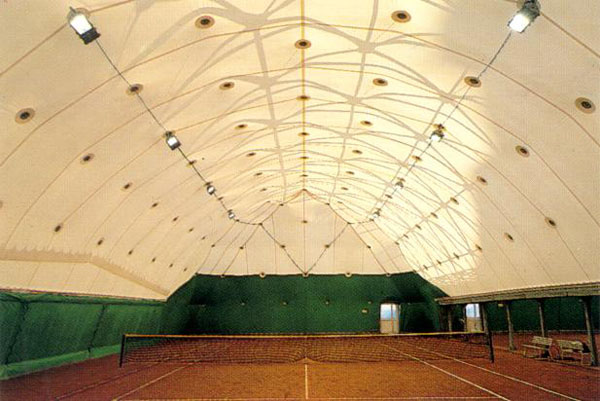 La struttura è calcolata per il sovraccarico di neve + vento + pretensione + peso proprio. La membrana di copertura è confezionata in tessuto poliestere Trevira ad alta tenacità spalmato PVC, resistente alle intemperie, è posta sotto la struttura e tensionata mediante catene e speciali dischi parastrappi, con innegabili vantaggi di durata e con riduzione notevole del problema condensa.
