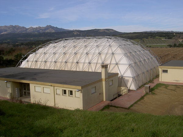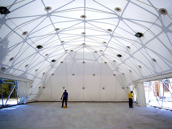 La geostruttura è la combinazione di una struttura metallica a geometria spaziale modulare (aste e nodi) con la singola e/o doppia membrana sottostante opportunamente tensionata e stabilizzata. I vantaggi del modello con copertura a doppia membrana sono essenzialmente: la coibenza, con un importante riduzione del coefficiente termico, una migliore abitabilità nelle stagioni intermedie, una riduzione della formazione di condensa e una minore risonanza acustica.