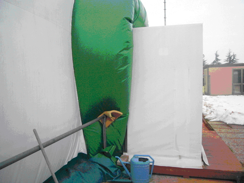 Europlast presenta la nuova pressostruttura a doppia membrana Energy, con intercapedine calibrata e appositi distanziatori interni che mantengono una distanza costante tra le due membrane (40 cm su tutta la superficie), all’interno delle quali viene soffiata aria proveniente dal generatore di aria calda.