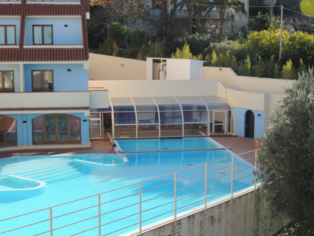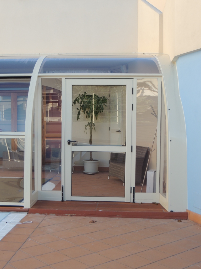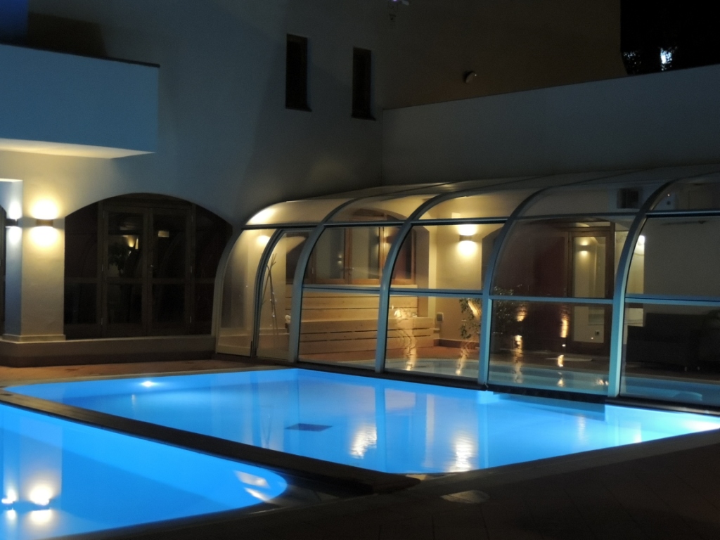Il modello Rame può essere fatto solo nella versione alta e ha una forma particolare, arrotondata sui lati. Può essere fissa, telescopica, integrale o addossata a una parete. Addossata alla parte, come visibile nella foto, è ideale per coprire piscine in centri benessere e minipiscine idromassaggio.