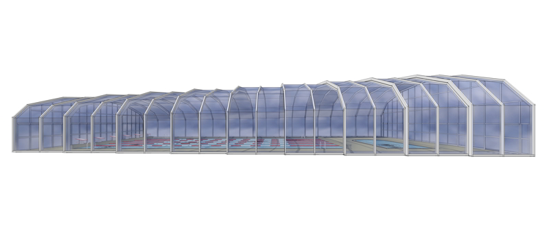 La struttura è realizzata con profilati estrusi di alluminio (dim. 240 x 80 mm), tamponamenti laterali in policarbonato trasparente sulle pareti laterali e le facciate e tetto in policarbonato alveolare. Le pareti sono hanno profilati in alluminio e tamponamenti in policarbonato trasparente. Il sostegno e la movimentazione avvengono mediante un sistema di guide che scorrono su binari in estruso di alluminio dimensionati e posizionati in batteria sotto il piano del pavimento; dentro a tale sistema di guide alloggiano e scorrono i carrelli di sostegno con ruote fisse e regolabili per l’ottimizzazione dello spostamento. I carrelli di scorrimento all’interno dei binari sono facilmente scollegabili dai relativi moduli, in modo da poter essere portati in zona “fuori binario” e recuperati per eventuali interventi di manutenzione o per permettere la sostituzione di componenti eventualmente danneggiati.