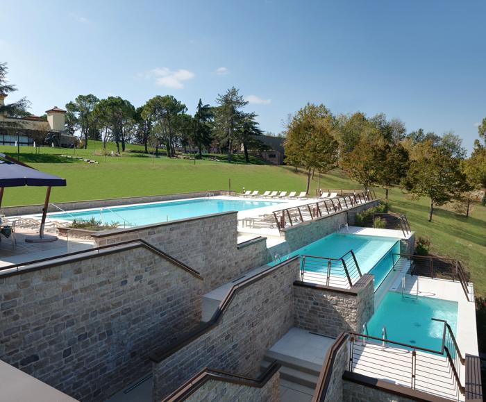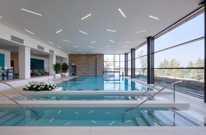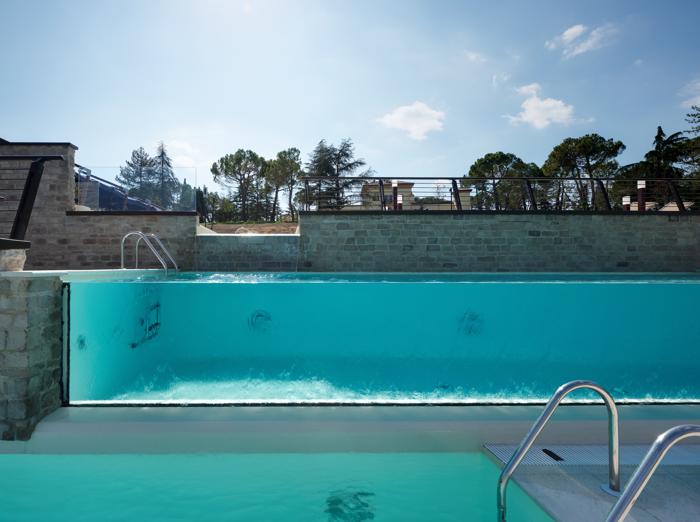 L'azienda AQUA ha realizzato: 1) Piscina interna in cemento armato di forma rettangolare + appendice esterna a spicchio. Superficie: 105 mq, profondità: 0,8-1,35 m. Rivestimento in gres porcellanato. Impianto trattamento acqua: 2 filtri VTR a piastra, portata 42 mc/h ciascuno. Circolazione a skimmer e a sfioro, 20 bocchette e 2 skimmer. Riscaldamento con scambiatore a piastra. Accessori: percorso flebologico, botti idromassaggio, lettini geyser, piastre geyser a pavimento, getti cervicali, tappeto d’aria e tapparella automatica di copertura nella parte esterna. 2) Piscina a terrazza esterna rettangolare, in cemento armato. Dimensioni: 20x10 m piscina principale; 10x3,60 m intermedia; 5,60x2,50 m bassa, profondità: 0,8 – 1,35 m. Rivestimento: interno in liner PVC, esterno in pietra ricostruita. Impianto di filtrazione: 2 filtri VTR a piastra, portata 89 mc/h ciascuno. Circolazione a sfioro, 27 bocchette. Riscaldamento con scambiatore a piastra. Accessori: pannello in PMMA trasparente.