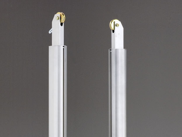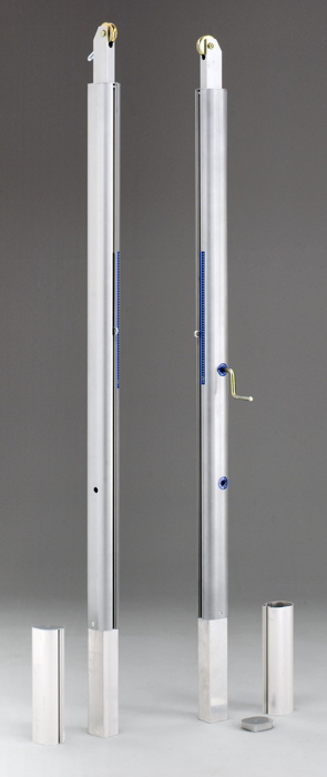 L'arganello tendirete è autofrenante, senza cremagliera, dotato di tirante in ppl antinfortunistico. Sia la manovella tendi rete sia quella per regolare l'altezza dei pali è asportabile ed è posta all'esterno del palo. Il cavo della rete viene agganciato senza moschettoni e fissato all'argano a scomparsa sul palo; all'estremità superiore, il cavo scivola su una rotella in acciaio montata su cuscinetto e pattini in nylon fissati all'interno del palo ne facilitano lo scorrimento. La rete può essere alzata o abbassata senza doverla smontare, con un'escursione del tiraggio di circa 50 cm. Il sistema è fornito completo di bussole e tappi in alluminio con rinforzi centrali tagliati al laser. Peso complessivo: circa 40 kg, sezione del palo esterno 120x100 mm.
