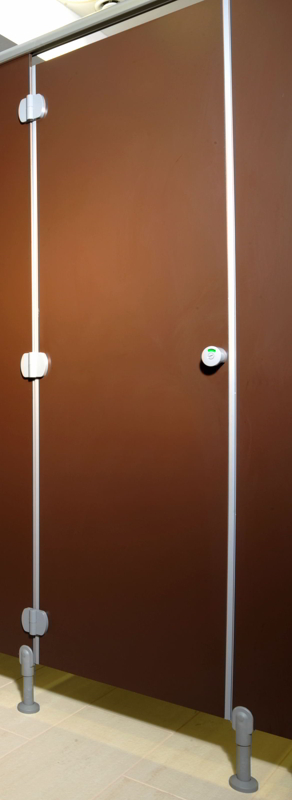 Le pareti sanitarie Ges Group sono realizzate in laminato plastico stratificato (HPL), spessore di 14 mm, bordi smussati e angoli arrotondati. Le porte, realizzate nel medesimo materiale, sono dotate di profili di battuta ammortizzanti in coestruso di PVC rigido (lato battuta) e morbido anti-infortunio (lato cerniere), che consentono un’assoluta complanarità frontale. Il sistema di apertura è dotato di serratura in nylon stampato con blocco di segnalatore libero/occupato, munito di blocca porta di sicurezza e apertura d’emergenza dall’esterno.