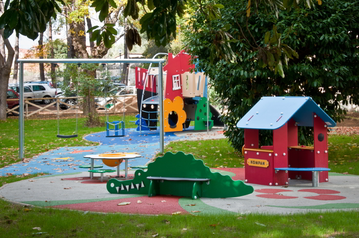 Le pavimenazioni di questo parco sono realizzate con gomma colata posata su una soletta in calcestruzzo con rete elettrosaldata, sopra la quale viene steso uno strato di 3cm di SBR (gomma riciclata a granulo più grande) e, come rifinitura, uno strato superficiale di 13mm di EPDM, colorata per realizzare i disegni visibili nelle foto. Le pavimentazioni in gomma colata, essendo drenanti, permettono di utilizzare le strutture anche dopo abbondanti piogge e, a differenza di altre pavimentazioni antitrauma (sabbia, corteccia e ghiaia), possono essere usate anche da persone disabili su sedia a rotelle. Inoltre, non richiedono manutenzione, ed eventuali atti vandalici possono essere riparati in modo semplice e a basso costo.
