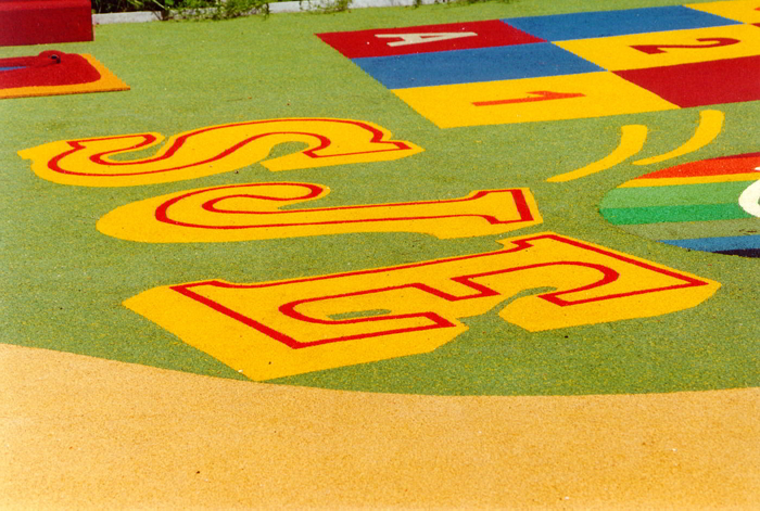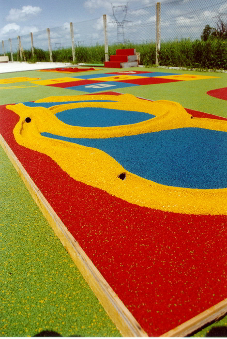 Pavimenti antitrauma per parchi gioco o zone polivalenti realizzati in leganti poliuretanici neutri e pigmentati, primer, vernici alifatiche, agenti liscianti, granuli EPDM vergini, SBR di recupero, miscelatori ed attrezzatura specifica per la realizzazione dei manti.