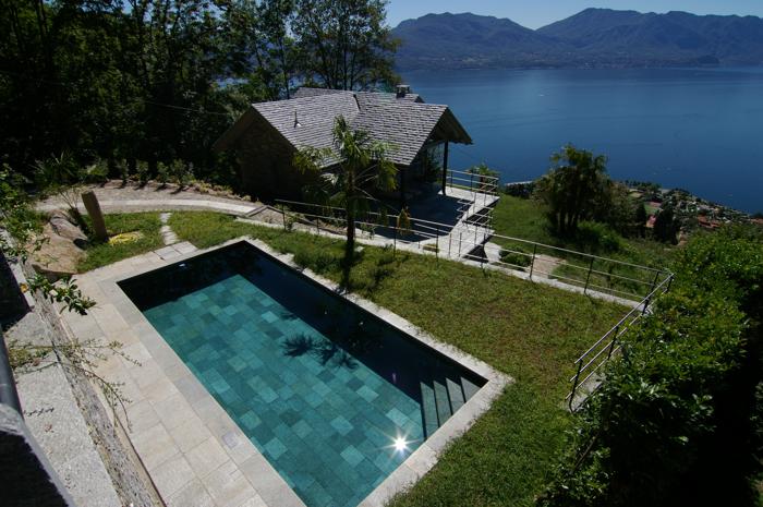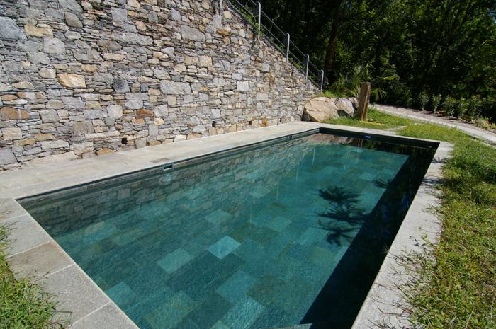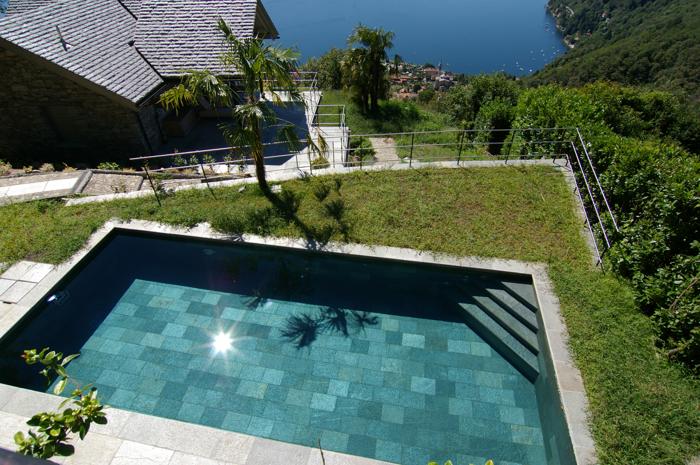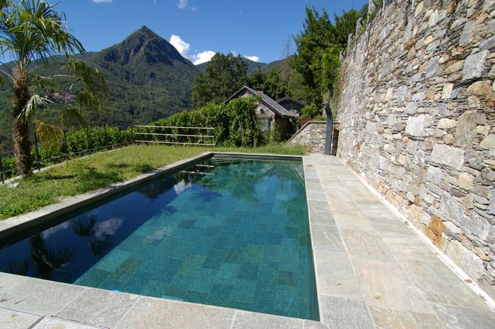 Una piscina inserita in un contesto naturale di pregio, con affaccio verso il lago e le montagne. Nella sua semplicità, trasmette un immediato senso di armonia con tutto ciò che la circonda, recuperando i codici stilistici di un'architettura in pietra tipica di questo luogo.