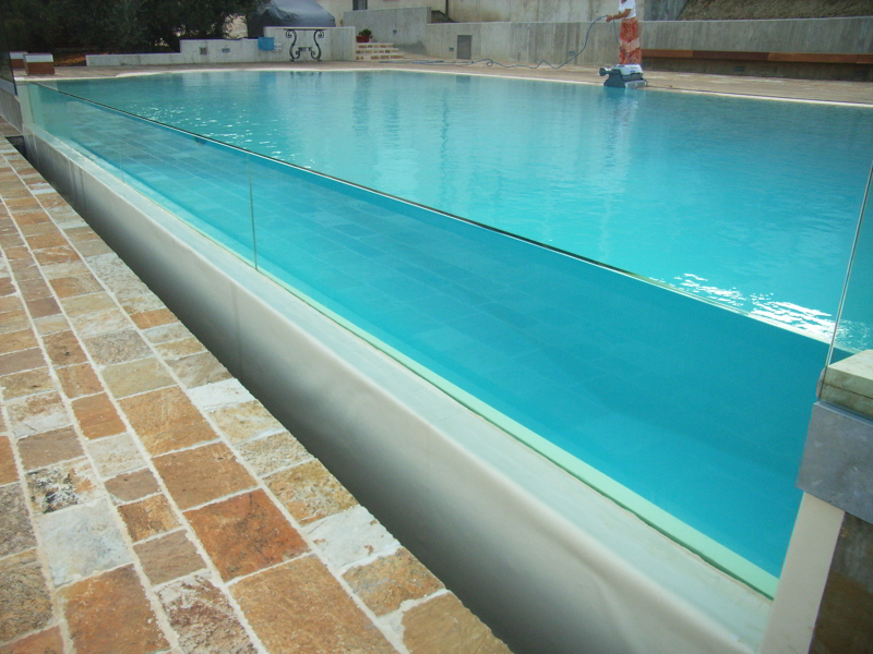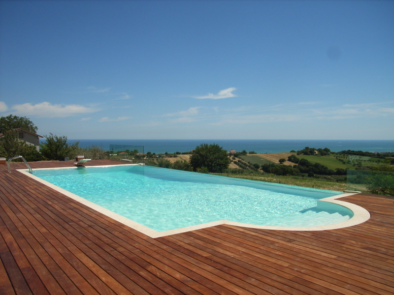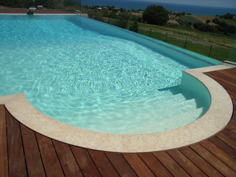 Piscina privata realizzata in una collina nelle vicinanze di Ancona. La vasca ha dimensioni 6x12 e accoglie una scala romana con impianto idromassaggio a 4 bocchette; ai piedi della scala è stato inserito un gayser dal fondo a tre bocchette. Lo sfioro è stato realizzato su tutto il perimetro; su tre lati è in pietra, mentre sul lato lungo verso il mare la parete è stata realizzata in vetro. Il vetro è stato realizzato ad hoc ed è stato fornito in 4 lastre di spessore 32 mm da 3 ml cad.; il fissaggio alla struttura avviene tramite incasso nel cemento armato.
