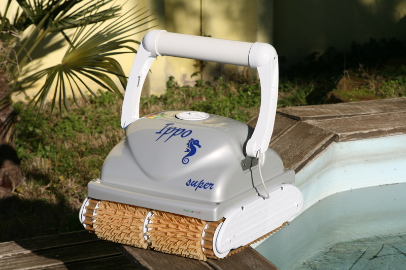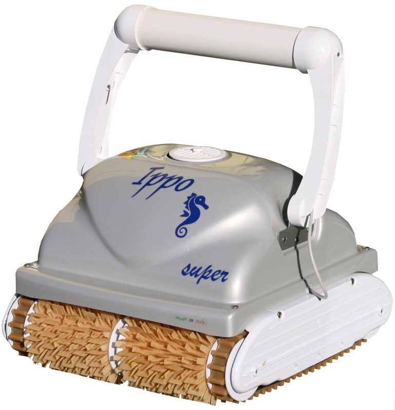 Pulitore automatico interamente costruito in Italia da International Caratti: IPPO SUPER, progettato per la pulizia di piscine pubbliche fino a 25 x 12,5 m, con cavo flottante da 30 m e partenza posticipata.