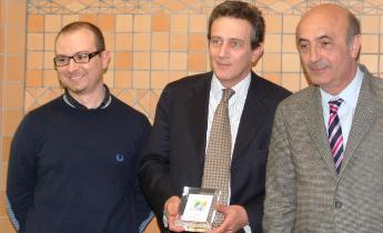 Nell'immagine (da sinistra a destra): Giulio Saltarelli (Responsabile Comunicazione) e Giovanni Grossi (Direttore Finanziario) ricevono il premio dal presidente della provincia di Modena Emilio Sabattini.