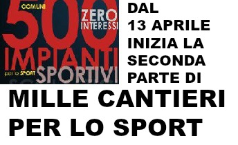 Il 13 aprile parte la seconda fase, tanto attesa dal mondo sportivo, di 1000 cantieri per lo sport , l'iniziativa creata da Istituto per il Credito Sportivo e dalla Presidenza del Consiglio dei Ministri per venire incontro alle esigenze di ristrutturazione e costruzione degli impianti sportivi italiani, sia scolastici sia di base.